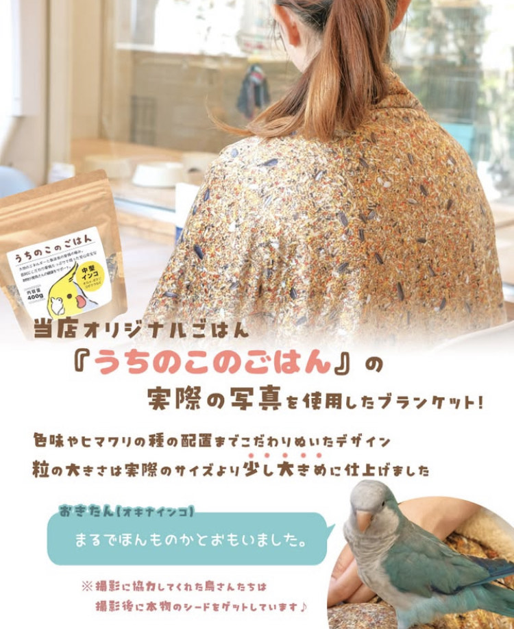 当店オリジナルの鳥さんフード『うちのこのごはん』の写真を使用したブランケットが登場!!