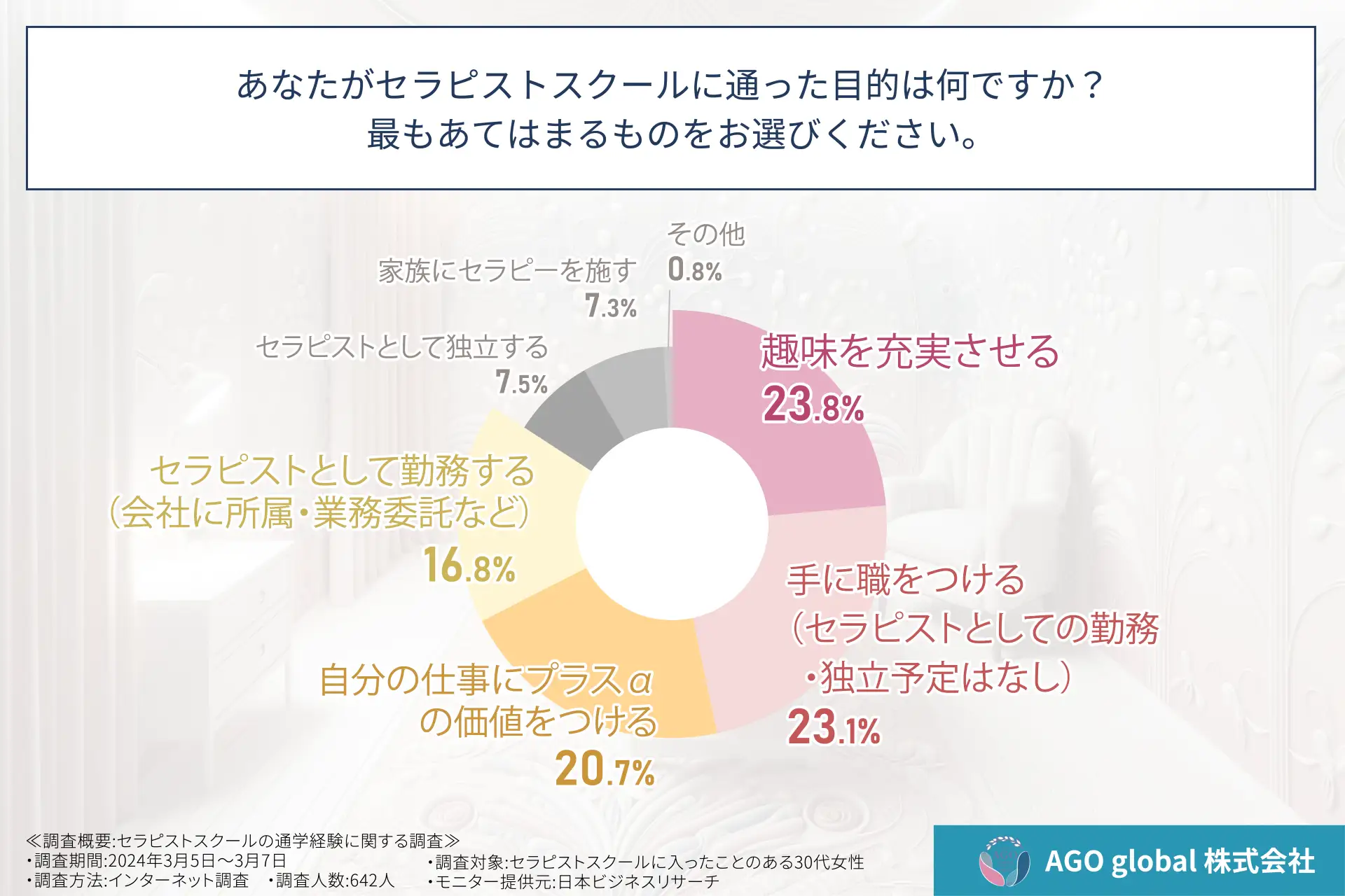 AGOセラピストスクール(本社:東京都港区、代表取締役:湯山 卓)は、この度、セラピストスクールに入ったことのある30代女性642人を対象に、セラピストスクールの通学経験に関する調査を実施いたしましたので、お知らせいたします。