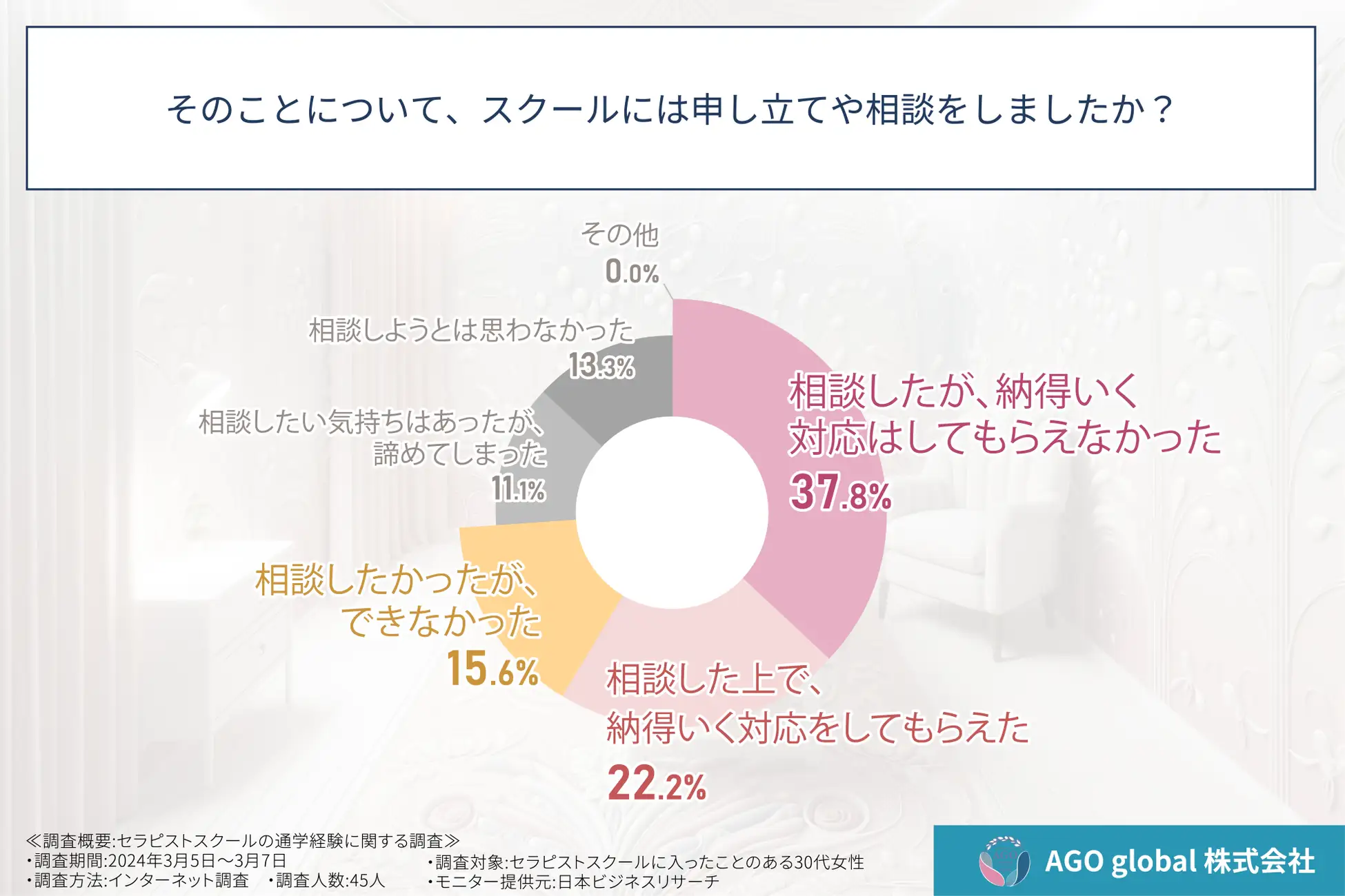 続けて、スクールに不満を持った45人を対象に、スクールに対して申し立てや相談をしたかどうかも聞いてみました。